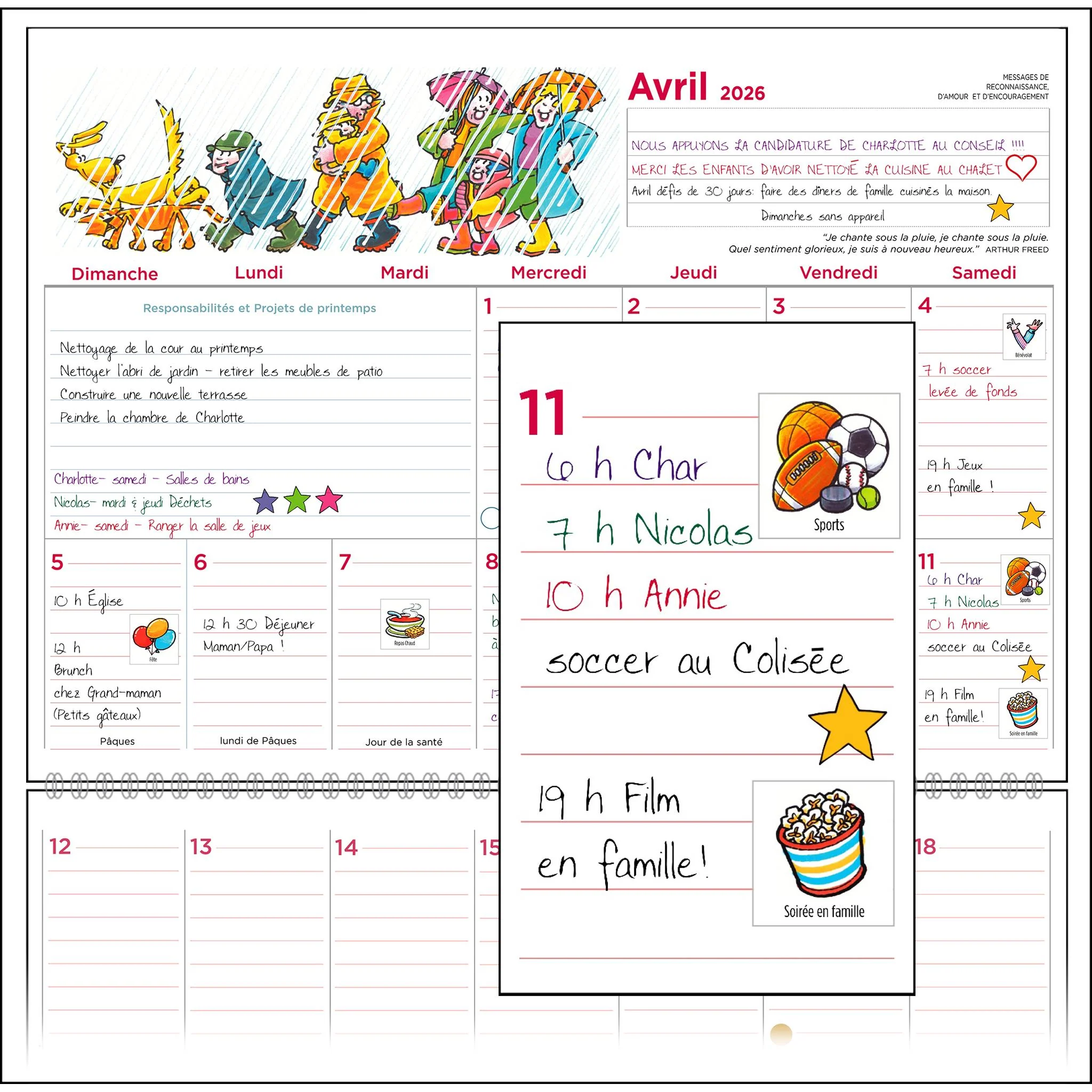 Produit au Canada. L'Agenda Familial®, le meilleur et best-seller a été conçu par des mamans pour améliorer la qualité de vie familiale et vous aider à passer plus de temps avec vos enfants. Si vous le voyez, vous pouvez le faire. En le mettant sur papier, vous pouvez prendre le contrôle de votre vie et choisir de vivre des choses agréables plutôt que de laisser le chaos vous envahir. Cet calendrier familial a aidé des millions de familles à garder une maison organisée et à gagner du temps depuis plus de 30 ans. Si vous l'essayez, vous vous demanderez probablement comment vous avez pu vous en passer ! Avec ses carrés extra-larges, il y a de la place pour toute la famille. Plus de 500 autocollants colorés rendent la planification stimulante et amusante ; même les enfants voudront participer. De plus, notre papier effaçable facilite la mise à jour des plans lorsque la vie change. Des rendez-vous chez le dentiste aux soirées de jeux, tout est prévu. Conçu et imprimé fièrement au Canada, ce calendrier est conçu pour durer toute l'année. Accrochez-le dans votre cuisine, votre salle de commande ou votre bureau et ayez l'esprit tranquille en sachant que tout est au même endroit. Parfait pour les familles occupées, les grandparents, les enseignants, et comme cadeau attentionné ! - - - The original and best-selling family organizer was designed by moms to increase the quality of family life and to help you spend more time with your children. If you can see it, you can do it. If you put pen to paper you can take control of your life to the extent that you can choose to do happy things rather than let chaos happen to you. This organizer has helped millions of families keep an organized home and find more time over the past 18 years. Perhaps we you will love it too and wonder how you ever got along without it!