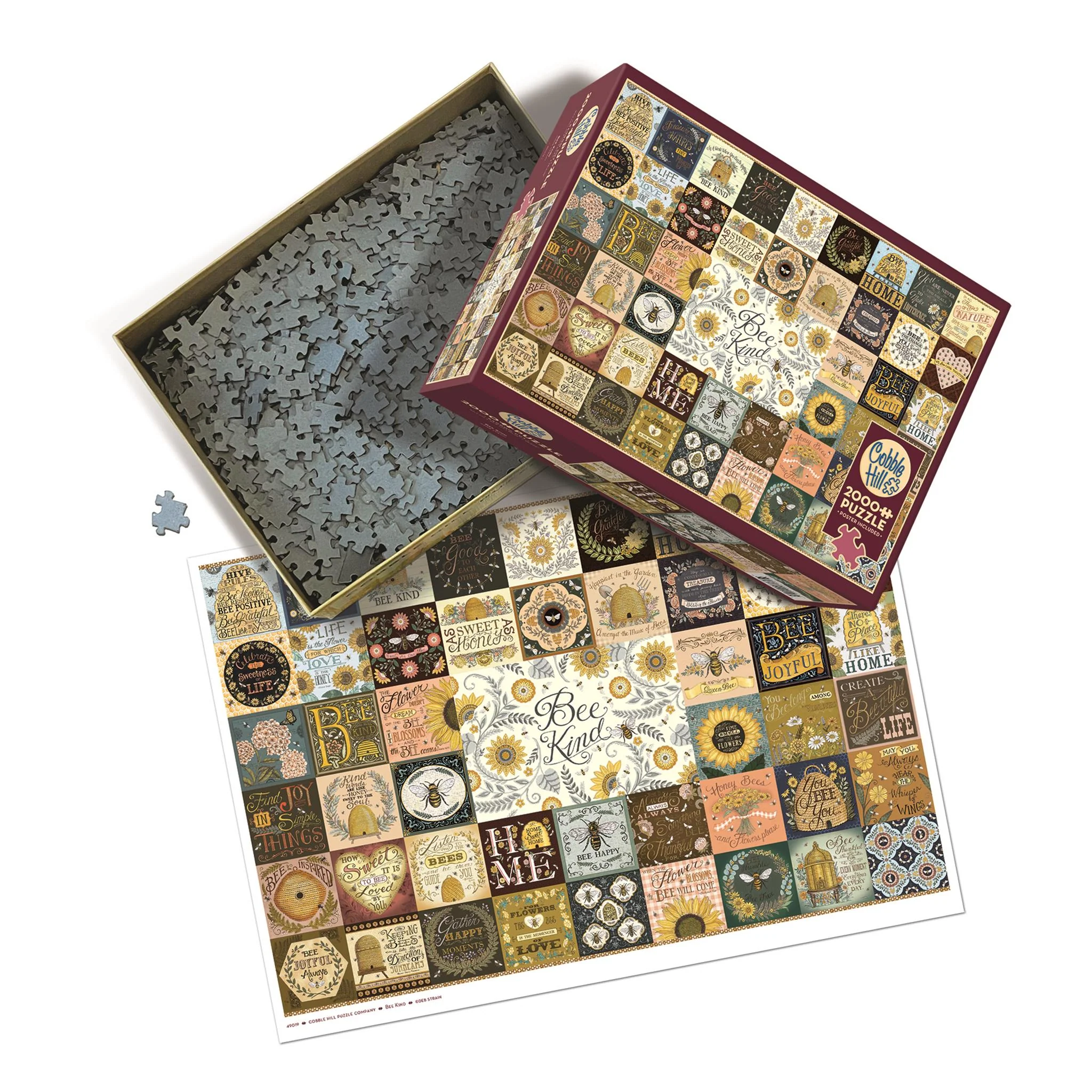 Bee Kind is a delightful collage that honours the busy, humble lives of bees and their dedicated caretakers. Designed with a mix of calendar art and fabric patterns by artist Deb Strain, this 2,000 piece puzzle is buzzing with sweet bee quotes. Cobble Hill puzzles feature interesting random-shaped pieces, so no two pieces are alike. Includes a handy poster.