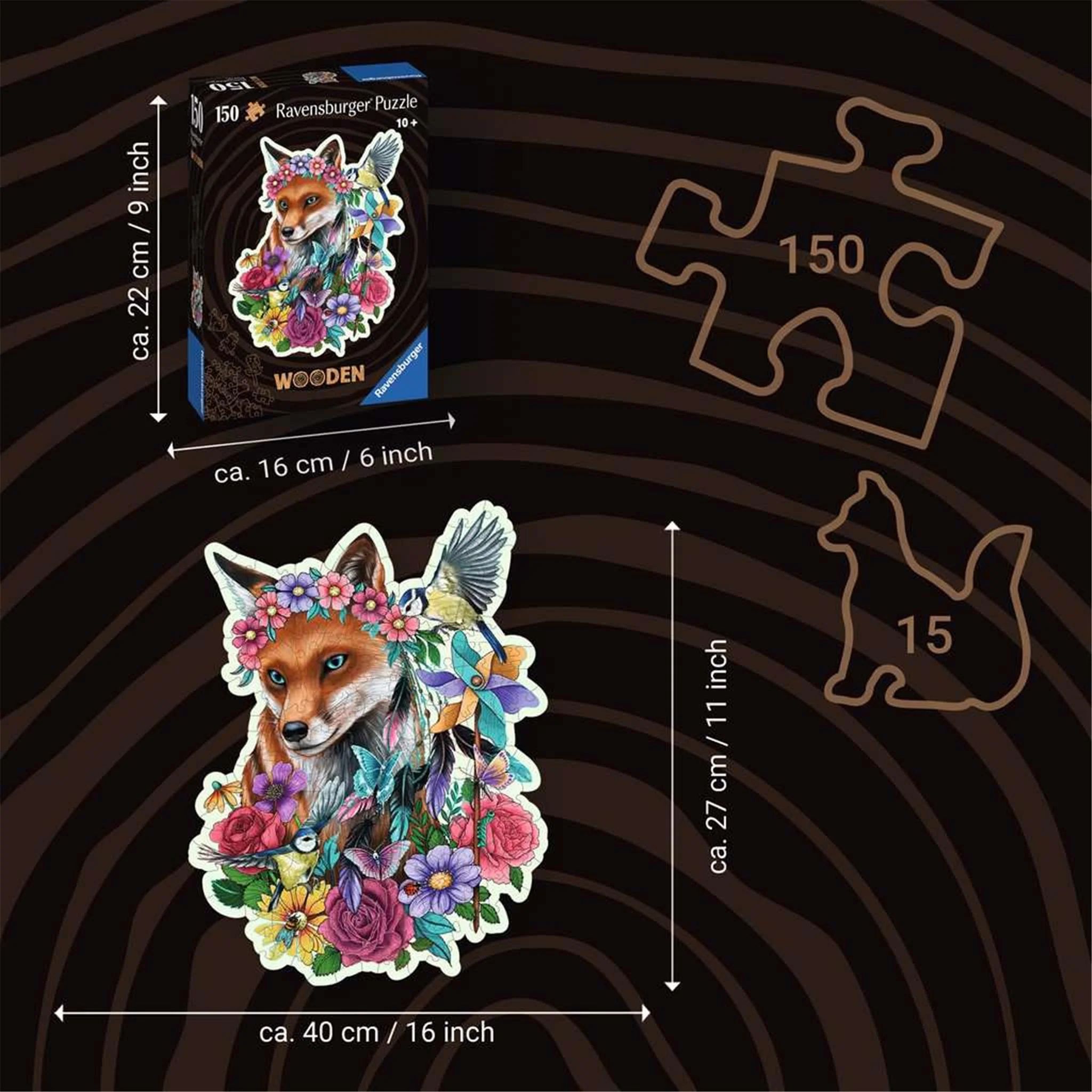 Watch out — this sly red “Fox” Shaped Wooden puzzle, bedecked in beautiful blooms, may just sneak into your heart! Spend time relaxing with nature! Our 150-piece “Fox” Shaped Wooden puzzle is hand designed with smooth, laser cut edges for hours of puzzle fun. The colorful illustration is printed directly on the wood for a vibrant puzzling experience. Inspired by the image, 15 delightful whimsy pieces are incorporated within! Made of eco-friendly engineered wood and packed in a biodegradable paper bag, this sturdy puzzle makes a thoughtful, sustainable gift for your favorite nature lover or environmentalist! Made by expert designers, 15 of our wooden jigsaw pieces come in unique and delightful shapes like a butterfly, bird, foxes and more! The interlocking pieces feel smooth to the touch and are made of premium wood with a natural, outdoorsy scent. The image is printed directly on the wooden material (not on paper) so there’s no chance of it peeling or colors fading over time. The sturdy pieces are just over 1/8 inch (4mm) thick to ensure lots of long-lasting fun as you make this delightful puzzle over and over again! From fun family times to long-term health benefits like stress-reducing, mindful moments, there are so many positives about puzzles! Makes a thoughtful birthday, Christmas, or holiday gift. Create memorable moments with Ravensburger premium puzzles today!