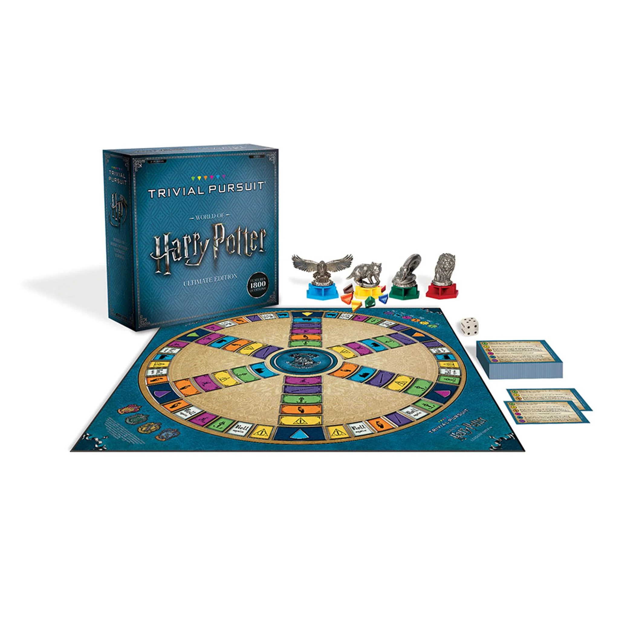 HARRY POTTER fans test their knowledge of all 8 Harry Potter movies with TRIVIAL PURSUIT: World of Harry Potter Ultimate Edition. Move around the board with House Mascot movers as you answer questions and collect wedges. Includes 1800 questions to challenge the ultimate Harry Potter fan. Categories include: Slytherin House, Death Eaters & The Dark Arts Animals, Magical Creatures & Magical Beings Witches, Wizards, Ghosts & Muggles Hogwarts, Other Locations & Transportation Spells, Potions & Other Magic