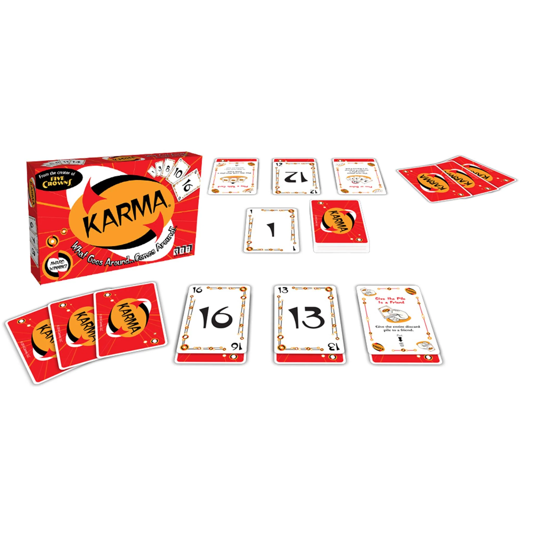 "Karma" is an elimination-style card game that allows for multiple winners. Race to get rid of your cards by playing a card of equal or higher value, but watch out… if you can't play a card, you have to take the whole discard pile. Luckily, there are Karma cards that could get you out of trouble… and maybe cause trouble for someone else. Use them wisely, because "what goes around comes around".