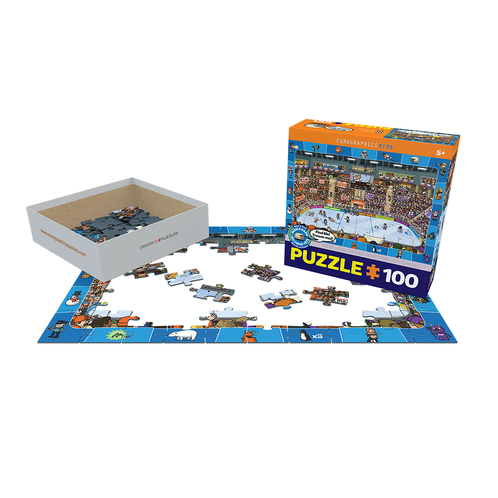 EuroGraphics Spot & Find Hockey 100-Piece Puzzle. Box size: 8" x 8" x 2.37". Finished Puzzle Size: 13" x 19". Lots of fun happens at the hockey game, but you'll have to look carefully to make sure you don't miss any of it. This unique spot & find game adds to the fun of a jigsaw puzzle by challenging kids to find hidden items inside the picture. Strong high-quality puzzle pieces. Made from recycled board and printed with vegetable based ink.